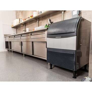 Undercounter Ice Maker with Bin, cube style, air-cooled, 24" width, self-contained condenser, production capacity up to 270 lb/24 hours, 80 lb bin storage capacity, medium cube size, front facing removable air filter, recessed utility chase, unit specific QR code, ice scoop included, 6" adjustable legs, 230v/50/1-ph, engineered and assembled in USA (Export Model, 50hz version)